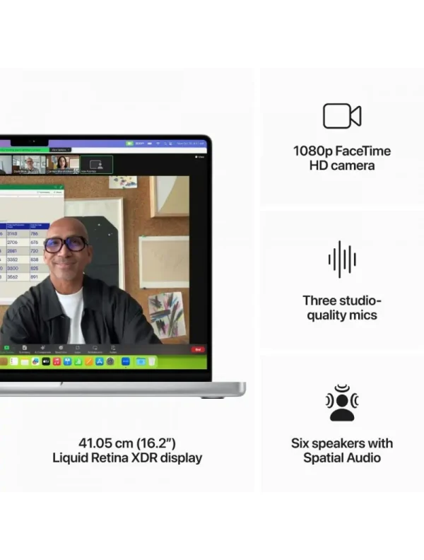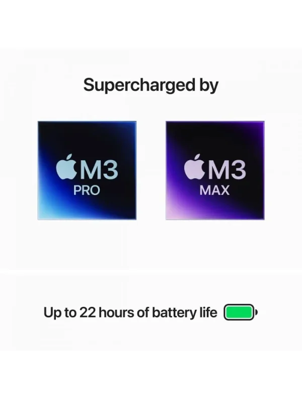 About This Item Supercharged by M3 Pro or M3 Max: The Apple M3 Pro chip, with an up to 12-core CPU and up to 18-core GPU using hardware-accelerated ray tracing, delivers amazing performance for demanding workflows like manipulating gigapixel panoramas or compiling millions of lines of code. M3 Max, with an up to 16-core CPU and up to 40-core GPU, drives extreme performance for the most advanced workflows like rendering intricate 3D content or developing transformer models with billions of parameters. Up to 18 Hours of Battery Life: Go all day thanks to the power-efficient design of Apple silicon. MacBook Pro delivers the same exceptional performance whether it’s running on battery or plugged in. Responsive Unified Memory and Storage: Up to 36GB (M3 Pro) or up to 128GB (M3 Max) of unified memory makes everything you do fast and fluid. Up to 4TB (M3 Pro) or up to 8TB (M3 Max) of superfast SSD storage launches apps and opens files in an instant. Brilliant Pro Display: The 35.97 cm (14.2″) Liquid Retina XDR display features Extreme Dynamic Range. 1,000 nits of sustained brightness for stunning HDR content. Up to 600 nits of brightness for SDR content. Pro reference modes for doing your best work on the go. Fully Compatible: All your pro apps run lightning fast — including Adobe Creative Cloud, Apple Xcode, Microsoft 365, SideFX Houdini, MathWorks MATLAB, Medivis SurgicalAR, and many of your favorite iPhone and iPad apps. With macOS, work and play on your Mac are even more powerful. Elevate your presence on video calls, access information in all-new ways, and discover even more ways to personalize your Mac. Advanced Camera and Audio: Look sharp and sound great with a 1080p FaceTime HD camera, a studio-quality three-mic array, and a six-speaker sound system with Spatial Audio. Connect It All: This MacBook Pro features a MagSafe charging port, three Thunderbolt 4 ports, an SDXC card slot, an HDMI port, and a headphone jack. Enjoy fast wireless connectivity with Wi-Fi 6E and Bluetooth 5.3. Connect up to two external displays with M3 Pro, or up to four with M3 Max.